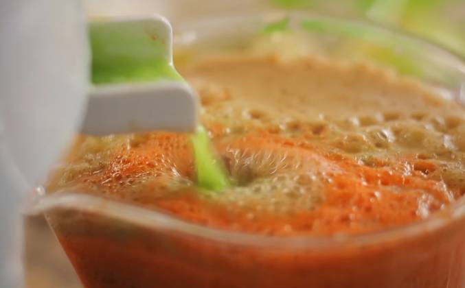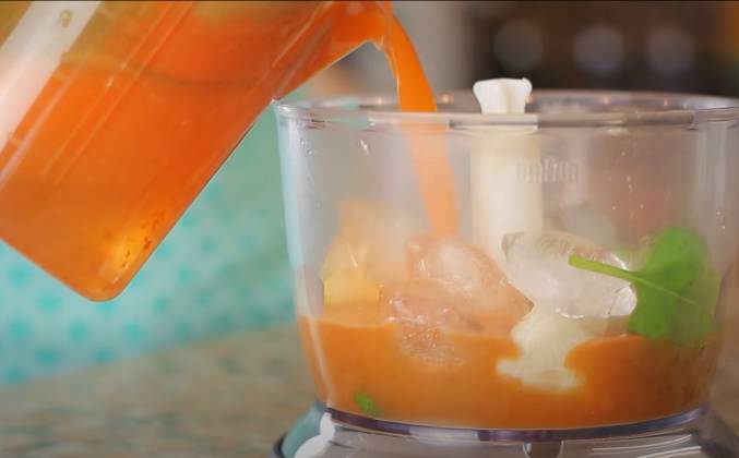 2. Выкладываем яблоко, морковь, грушу, огурец и имбирь в соковыжималку. После того как выжали сок добавляем в блендер 1/2 банана, 1/4 груши, веточку базилика и лед. Заливаем получившимся соком и перемешиваем в течение 1 минуты. Оранжевый смузи готов! Имбирь придает этому коктейлю незабываемый, и неповторимый вкус.