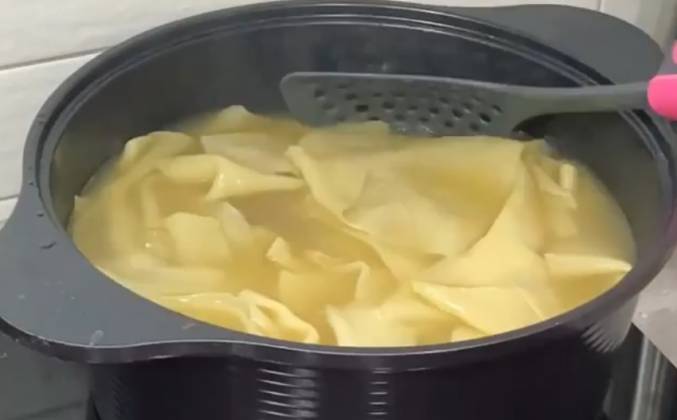 2. Ну а пока замесим тесто на бешбармак. Используем 2 яйца, соль, муку и воду. Тесто должно быть как на пельмени, не слишком тугое и не слишком мягкое. Кто-то замешивает тесто на бульоне, в котором варилось мясо, ну а я решила на воде замесить) Раскатываем тесто в тонкий пласт и нарезаем на квадраты примерно 10см. Отвариваем их в бульоне минут 5-6. Готовим лук для бешбармака. Для этого 2-3шт репчатого лука нарезать полукольцами, добавить чёрного перца и бульона (снимайте самый жирный верх бульона).