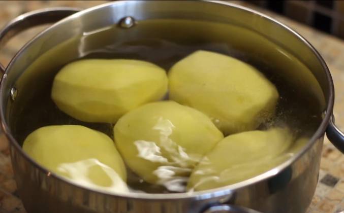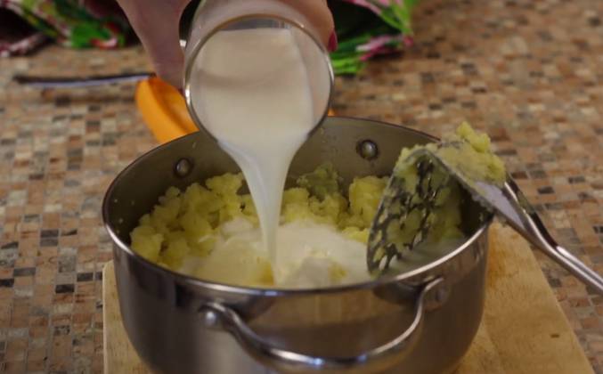 2.  Если у вас вода слишком сильно закипела, то просто можете снизить огонь и варить дальше. Картофель варится у нас уже где-то 40 минут, сейчас мы проверим его вилкой. Так... картофель нас хорошо разваливается, значит он уже у нас готов и можно сливать воду! Как только слили воду, возьмем толкушку и начнем разминать картофель, следом добавим соль, масло и теплое молоко. Все хорошенько взбиваем!