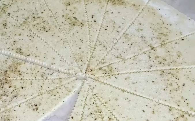 2. Берём одну часть и раскатываем в тонкий пласт, сахар и орехи равномерно посыпьте на раскатанные круги теста. Каждый из кругов разрежьте на треугольнички. Начинайте сворачивать тесто в трубочки, начиная с широкого края треугольника. С одной части теста у меня получается 18-20 рогаликов.