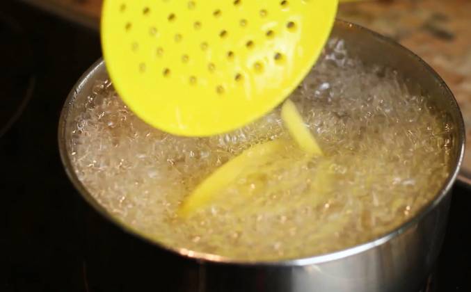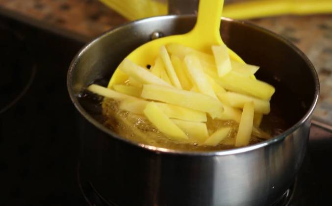 2. Для чего мы замораживаем картофель? Это все для того, чтобы как раз таки получить хрустящую корочку и мягкость внутри. Если мы не будем замораживать и кинем сразу в кипящее масло, то получим мягкий картофель, и уже никакой картошки фри у нас не получится! Поэтому, товарищи, замораживаем и жарим! В небольшую кастрюльку наливаем растительное масло, наливаем не до самых краев, чтобы нас не обстреляло сильно кипящим маслом! это не очень приятно!