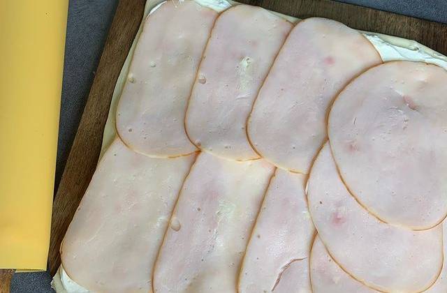 2. Одну часть смазывать творожным сыром, выложить ветчину, накрыть второй частью. Нарезать на полоски и сложить елочку так, как показано в видео.
