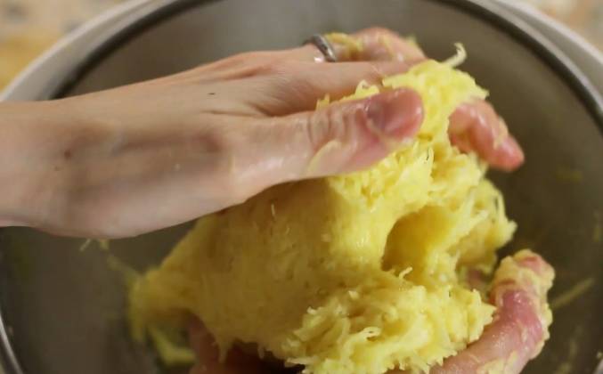 2. Все вместе хорошо перемешиваем. И немножко надавливаем для того, чтобы наш крахмал вытек. Теперь картофель посолим и поперчим и добавим немножко муки для того, чтобы наш картофельные оладьи лучше взялись! Хорошо перемешиваем! Ставим сковороду на плиту, наливаем растительное масло, включаем сильный огонь и как только у нас масло разогреется выкладываем наши драники.