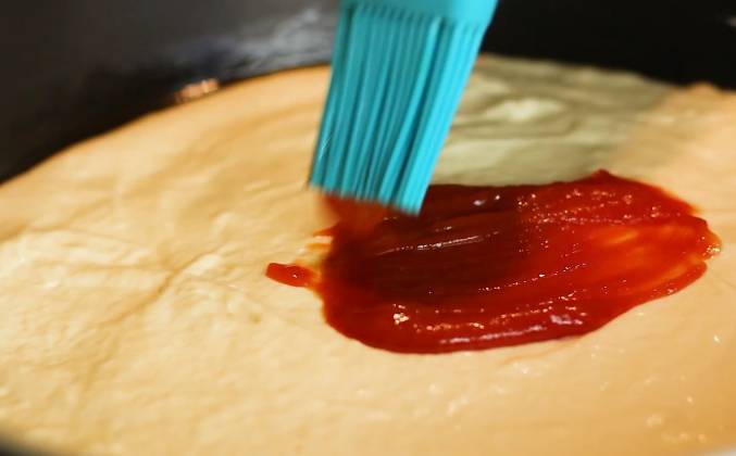 2. Подготовим остальные ингредиенты: не крупно порежем колбасу, нарежем лук полукольцами, тонкими круглишками нарежем помидор, мелко нарежем зелень. На дно сковороды налью немного растительного масла, выливаем тесто, распределим по всему кругу. На тесто выложим немножко кетчупа и с помощью кисточки также размажем его. Выкладываем помидоры, следом добавляем лук, я добавлю побольше луку потому, что очень люблю его в пицце. Выкладываем колбасу, посыпаем сверху зеленью и не забываем про сыр. Накрываем крышкой и включаем средний огонь. Эта пицца у нас уже готова, по тесту уже видно, что все схватилось так, что огонь снимаем и выкладываем.