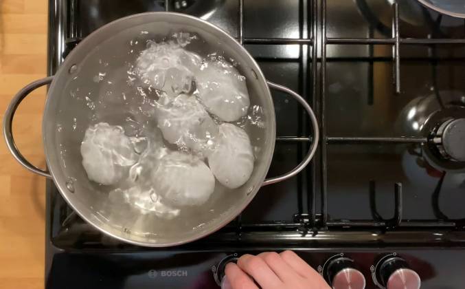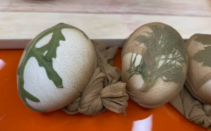 2. Колготки я порезала вот таким вот образом. Дальше увидите зачем мы собственно это сделали. На яйцо прикладываем зелень и отправляем наше яичко вот в такой вот синтетический капроновый носочек. Теперь наши яйца опускаем в краску и ждем столько времени сколько у нас написано на инструкции собственно к самой краске. Но, я думаю, что здесь стоит подольше подержать, так как у нас яичко еще и в носочке, чтобы все все таки у нас за красилось. Итак, друзья, прошло уже, наверное, 3 или 4 часа.
