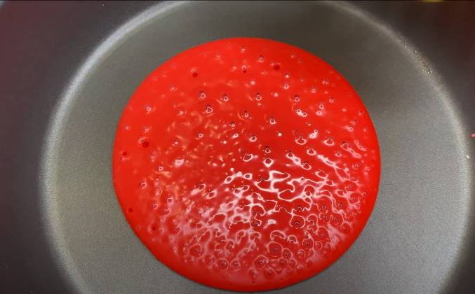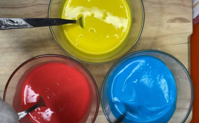 2. Смотрите - ни одного комочка у нас нету. Сейчас значит мы будем это тесто переливать вот в такие мисочки. Отдельно Для того чтобы окрасить. Итак, добавляем краску, размешиваем. Краски добавляем столько, чтобы насыщенность её нас устраивала. Обжариваем наши панкейки на молоке на сковородке с тефлоновым покрытием без добавления масла. Как только сковородка у нас нагрелась - выливаем аккуратно ложечку теста. Итак, друзья, как определить когда нам уже стоит переворачивать панкейки - смотрите боковинка у нас здесь уже пропеклась, поэтому мы смело уже вот так вот аккуратно лопаточкой подбираем и переворачиваем. Берем желтый. Смотрите, ребят, можно не только маленькие такие делать панкейки, как я делала красненькие и розовенькие вот такого размера, но можно сделать еще и сразу большой панкейк.
