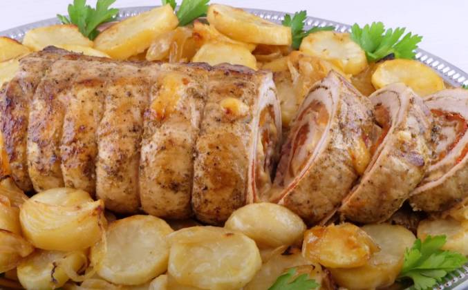 6. Но прежде, хочу показать вам насколько картофель и мясо мягкие и сочные. Этот способ приготовления подойдет для тех, кто переживает, что мясо, порой, готово, а картофель еще твердый. Держим противень в духовке до придания рулету и гарниру красивой румяной корочки. По готовности, достаем блюдо из духовки. Не снимая с противня, хочу показать вам, насколько сочным получается этот рулет. Снимаем шпагат и отрезаем порционный кусок. Вы только на это посмотрите… бесподобно сочный и аппетитный рулет! Перекладываем его на блюдо, снимаем кулинарную нить, а по бокам выкладываем ароматный запеченный картофель. Ну что же, друзья, мясной рулет на праздничный стол готов и можно всех приглашать к столу! Красивый, эффектный, очень вкусный!Видео рецепт ютуб ниже 👇