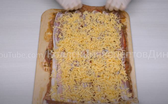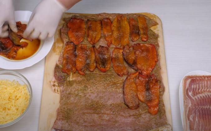 3. У меня перцы запекались 20 минут. Перекладываем их в миску или кастрюлю, накрываем крышкой и оставляем на 10-15 минут, чтобы они хорошо пропарились. Тем временем, 200-250 г твердого сыра нарезаем тонкими пластинками или натираем на крупной терке. Снимаем с перцев кожицу и складываем на тарелку. Разворачиваем пласт маринованного мяса и, начиная с того края, откуда будем сворачивать рулет, раскладываем на мясо запеченный перец без кожицы. Вместо перца можно использовать обжаренные грибы, лук с морковью, тонкие яичные блинчики, ломтики маринованных огурцов, маслины, свежую зелень, шпинат и т.д. Сок, оставшийся от перца, сливаем в миску с маринадом. Поверх перца выкладываем полоски бекона - он придаст сочность рулету.