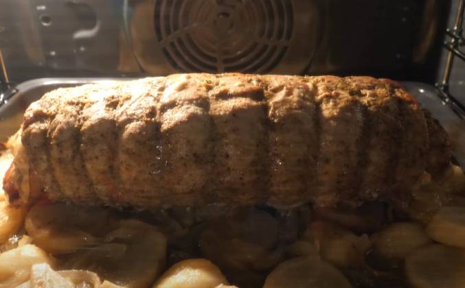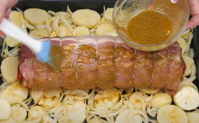5. Кроме того, можно использовать морковь, кабачки, грибы, сладкий перец, стебли сельдерея и т.д. Засыпаем овощи 1 ст.л. приправы для картофеля, она уже соленая и добавляем 2-3 ст.л. растительного масла. Все хорошо перемешиваем и овощная подушка для мясного рулета готова. Сверху на картофель выкладываем рулет и смазываем оставшимся маринадом. Для того, чтобы мясо успело полностью приготовиться, а картофель с луком за это время не сгорели, накрываем весь противень фольгой и плотно фиксируем ее по краям. Отправляем противень в духовку и запекаем при температуре 200°C на режиме Конвекция в течение часа. Через час снимаем с противня фольгу и снова отправляем в духовку на 20 минут для придания блюду красивого золотистого цвета, режим запекания и температура все те же.