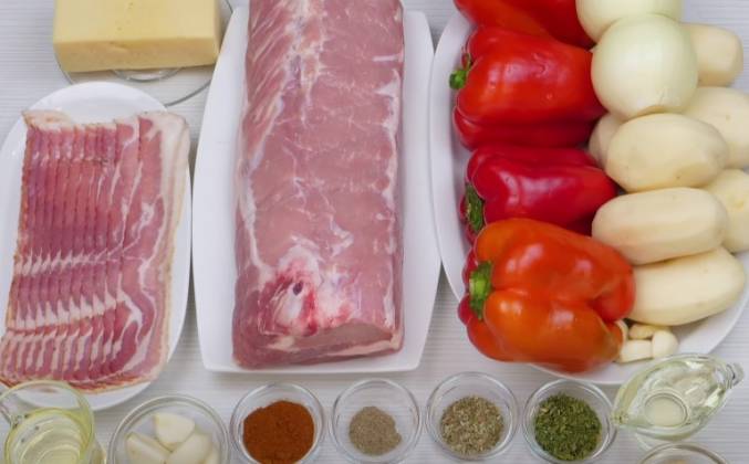 4. В этот раз у меня сыровяленый бекон, но можно взять варено-копченый. Если кусок мяса жирный, например, шейная часть, то бекон можно заменить на тонкие слайсы ветчины или вовсе не использовать. Сверху на бекон выкладываем натертый сыр и сворачиваем плотный рулет. Перевязываем его шпагатом или кулинарной нитью, чтобы придать форму будущему рулету. Если вам трудно его перевязать так, как мы это делали с бужениной, то думаю, такой способ вам больше подойдет. Лишний шпагат отрезаем. На этом этапе рулет можно обернуть пленкой и убрать в холодильник, а запечь непосредственно перед подачей на стол. Его можно подавать с любым гарниром, который вам нравится. Я приготовлю запеченный картофель. Для этого возьму 7 крупных очищенных картофелин, 2 крупные луковицы и несколько зубков чеснока. Картофель нарезаем довольно толстыми кусочками и сразу отправляем на противень. Количество гарнира и форма нарезки на ваше усмотрение - дольками, ломтиками или фигурным ножом. Туда же крупно режем чеснок и репчатый лук.