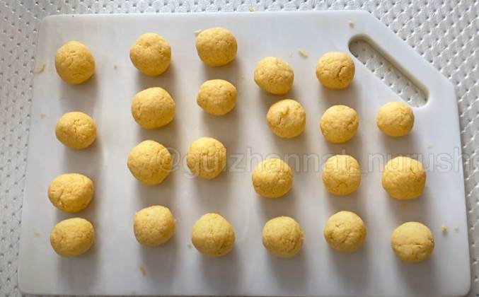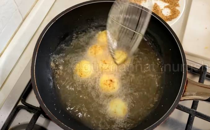 2.  С начала перемешивала силиконовой лопаткой. Затем перемешивала руками. У нас масса должна получится, как тесто. Берем немного массу и катаем шарики. Шарики должны быть чуть меньше грецкого ореха. Когда будем их жарить, они увеличатся в размерах. Поэтому их не надо делать большими. Эти шарики перемешаю с панировочными сухарями. После жарки шарики будут выглядеть красивее, но это не обязательно. Все на Ваше усмотрение. Если нет, то можно жарить без них. 3.  В это время сильно разогрейте сковороду с подсолнечным маслом. Жарим как баурсаки. Обязательно перемешивайте. Достаточно жарить 10-15 секунд. Жарим до золотистого цвета. Огонь должен быть сильный и масло должно быть сильно разогрето. Затем вынимаем шумовкой (ситом). Сырные шарики лучше кушать горячими. Внутри сыр тянется. И очень вкусно. Если они остынут, то можно разогреть в горячем масле и они опять вернут форму и станут тягучими. Думаю, Вам рецепт понравится.