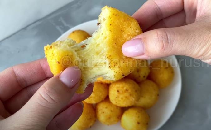 3.  В это время сильно разогрейте сковороду с подсолнечным маслом. Жарим как баурсаки. Обязательно перемешивайте. Достаточно жарить 10-15 секунд. Жарим до золотистого цвета. Огонь должен быть сильный и масло должно быть сильно разогрето. Затем вынимаем шумовкой (ситом). Сырные шарики лучше кушать горячими. Внутри сыр тянется. И очень вкусно. Если они остынут, то можно разогреть в горячем масле и они опять вернут форму и станут тягучими. Думаю, Вам рецепт понравится.Видео рецепт ютуб ниже 👇
