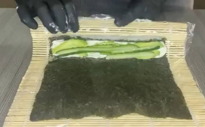 2. На нори выкладываем ровным слоем рис, распределяя его. Рис накрываем пищевой плёнкой и переворачиваем! Рис теперь окажется внизу. ⠀ На лист норм выкладываем сливочный сыр, формируя из него валик. Кладём на сыр авокадо 🥑 и огурец 🥒. ⠀ С помощью коврика аккуратно скручиваем в рулет и придаём нужную форму роллу! Сверху, на рис выкладываем ломтики рыбы! ⠀ Нарезаем ролл на кусочки.