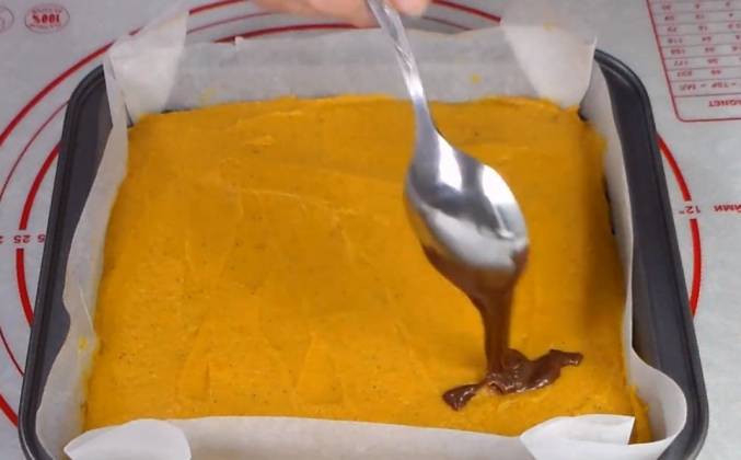 3. В завершение распределяю произвольном порядке остатки шоколадной массы и деревянной палочкой делаю легкий узоры, по поверхности. Выпекаем в заранее разогретой духовке, до 180 градусах, 30 минут. Процесс выпекания регулируйте по Вашей духовке. Готовое брауни с тыквой вынуть из формы и дать полностью остыть. После чего можно по желанию декорировать, нарезать на порции и продавать угощение к столу. Брауни из тыквы готово! Всем приятного чаепития! Спасибо, что были со Мной! С Вами была Марина! Всех благодарю за лайк, подписку и комментарии! До новых вкусных встреч на моём канале! Готовьте с хорошим настроением и у вас обязательно все получиться!Видео рецепт ютуб ниже 👇