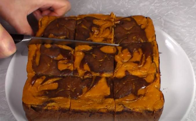 Шоколадный брауни из тыквы рецепт. Такое сочетание слоёв создаёт приятный ароматный вкус этому десерту. Готовится просто! Для приготовления понадобится. Для шоколадного слоя: черный шоколад, мука, сливочное масло, сахар, куриные яйца, соль. Для тыквенного слоя: запеченная тыква, сливки, сахарная пудра, кориться и немного соли.