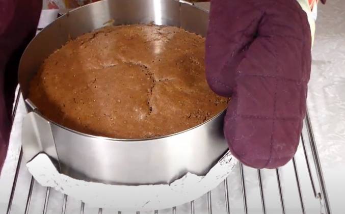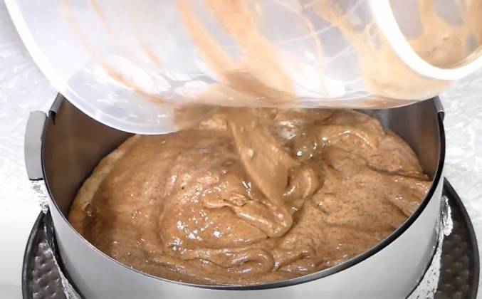 2. Готовую массу переложить в кулинарное кольцо, затянутая снизу фольгой, а на дно выложить пергамент. Если у вас разъемная форма простелите дно пергаментом. А бортики ничем не смазывайте. Прокрутить несколько раз кольцо или форму, чтобы тесто равномерно распределилось. Выпекать в заранее разогретой духовке, до 170 градусов, 40 - 50 минут. Все зависит от технических возможностей духовки.