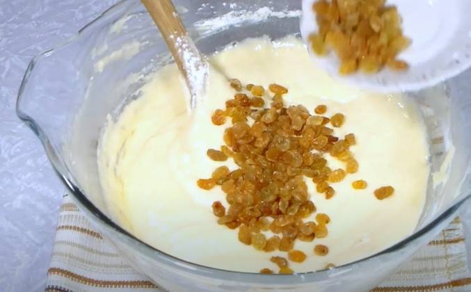 2. В яичную массу ввожу сметану. Мягкими движениями миксера перемешиваю. Затем в два приема ввожу мучную смесь и аккуратно перемешиваю лопаткой. В завершение добавляю промытый и обсушенный изюм. Немного изюма оставляю, чтобы добавить сверху теста. Аккуратно все перемешиваю. Готовое тесто перекладываю в форму застеленную пергаментом.