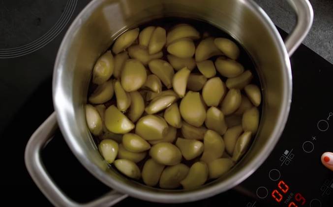 2. Совсем маленькие зубчики лучше не использовать, делайте так, чтобы они все были плюс-минус одного размера. Самый сложный и длительный процесс подготовки мы уже завершили, теперь нам нужно залить наш чеснок оливковым маслом, довести до кипения и оставить на самой низкой температуре готовится еще около часа, он будет томиться и карамелизироваться. Оливковое масло должно полностью покрыть чеснок. Включаем плиту. Еще раз, доводим до кипения, как только оливковое масло начнет булькать, выключаем на минимум и оставляем, накрыв крышкой, на целый час. Начало булькать, уменьшаем температуру. Когда наш чеснок готов, это можно попробовать просто ножом, если нож входит легко и чеснок полностью мягкий, значит уже блюдо готово.