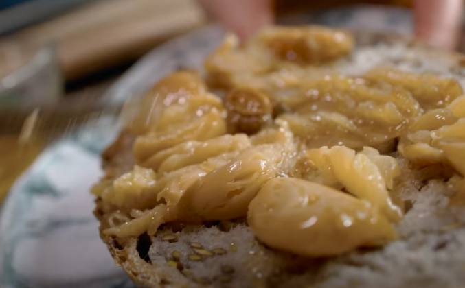 4. Но нам не терпится попробовать, поэтому мы сразу гаряче перекладываем вот сюда, и соберем из него очень вкусный сэндвич. Нам понадобится кусочек хлеба, кладем на него чесночинки, и небрежно разминаем вилкой. Здесь у нас вяленые томаты, я их готовила сама, но вы можете использовать готовые. Немного пармезана. Все готово! Этот чеснок можно использовать для салатных соусов, перемешивая его просто с другими ингредиентами, с оливковым маслом, с горчицей например, с лимонным соком. Так же его очень классно добавлять в готовое картофельное пюре, оно очень сильно меняет вкус блюда. Но и вообще, это отличный секретный ингредиент, который просто повысит качество ваших повседневных блюд.Видео рецепт ютуб ниже 👇