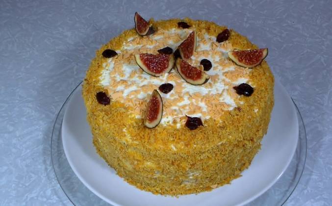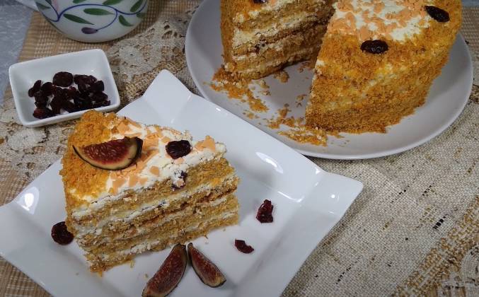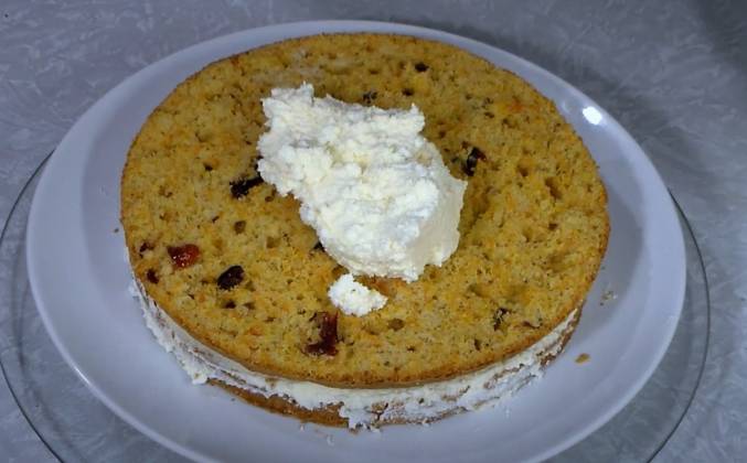 4. Готовый крем накрываю пищевой пленкой. Ставлю в холодильник, для охлаждения. Коржи выпекались 40 минут. Палочка полностью сухая. Даю им немного остыть и буду вынимать из формы. У полностью остывших коржей тоненьким слоем срезаю верхнюю часть макушки. Данная часть пойдёт на крошку. Коржи разрезаю на 3 равные части. Вот такие воздушные пористые получились коржи. Приступаю к сборке торта. На корж на ношу порцию крема. Разравниваю его по всей поверхности . Сверху кладу второй корж. Таким способом собираю весь торт. Морковный торт готов!Видео рецепт ютуб ниже 👇