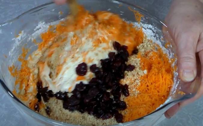 2. Масса посветлела, увеличилось в объеме и оставляет легкий след. Вливаю растительное масло и снова взбиваю миксером. в хорошо взбитую массу всыпаю просеянную муку со специями и перемешиваю все лопаткой. Ввожу натертую морковь. Хорошенечко перемешиваю. Добавляю часть измельченных орехов, немного оставляю, для присыпки готового торта. Добавляю вяленую клюкву. Всю массу перемешиваю, чтобы ингредиенты равномерно распределились. Выпекать коржи буду в двух формах. Формочки подготовила. Простелила пергаментной бумагой, а бортики смазала сливочным маслом и присыпала мукой. Зрительно распределяю полученную массу на две равные части.