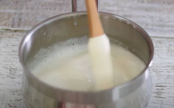 3. В сотейнике соединить кокосовое молоко с сахаром. На среднем огне довести до кипения. Снять с огня и добавить разбухший желатин, хорошо перемешать до полного растворения желатина. Полученную массу перелить в чистую миску, добавить растопленный белый шоколад и хорошо перемешать до однородности, остудить до 35°С. Затем добавить маскарпоне и хорошо перемешать до однородной массы без комочков. Охлажденные сливки взбить миксером до мягких пиков.