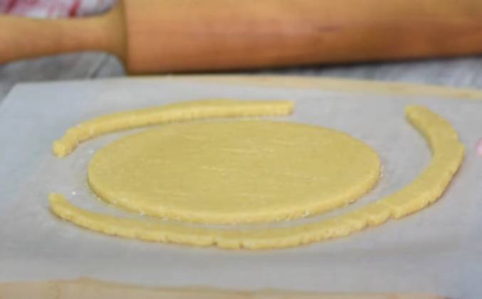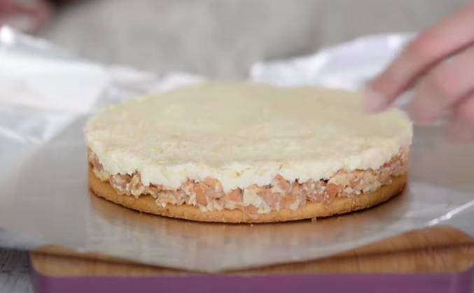 4. Постепенно ввести взбитые сливки в кокосовую массу. Ровную поверхность (например разделочную доску) застелить куском фольги или полиэтиленовой пленкой. На фольгу положить заготовку из коржа, убрать кольцо. Сверху положить кольцо диаметром 20 см (заготовка должно быть по центру кольца). Дно затянуть фольгой, стенки формы проложить бумагой для выпечки или кондитерской ацетатной плёнкой.