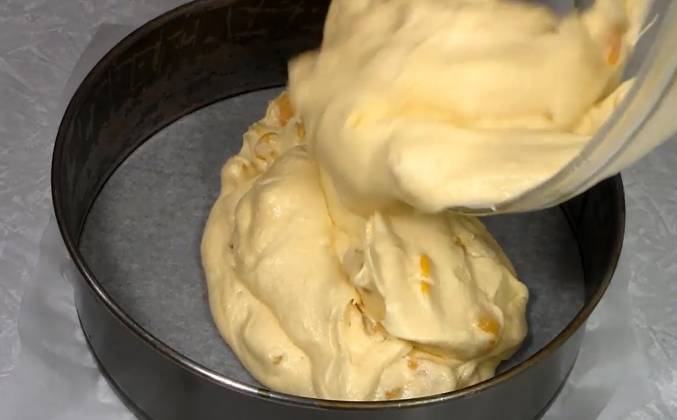 2. Вот такой консистенции оно получается. Переходим к дальнейшему этапу приготовления. Помытые персики очищаю от кожуры. Отделяю мякоть от косточки. Нарезаю дольками. Вторую половину персиков также очищаю от шкурки. Отделяю мякоть от косточки. Нарезаю кусочками. Персики порезанные кусочками отправляю в тесто. Аккуратно перемешиваю, чтобы кусочки персиков распределились по всей массе, равномерно. Полученную массу перекладываю в форму, предварительно застеленную пергаментом. Разравниваю.