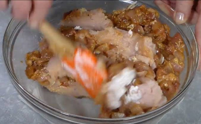 2. Измельчённое филе перекладываю в миску. Добавляю к нему маринованные кусочки мяса. Хорошенько перемешиваю массу. Через чесночный пресс пропускаю 2 зубчика чеснока. Добавляю все специи. Кукурузный крахмал. Еще раз все хорошенечко перемешиваю. Пробую на вкус. Если каких-то специй будет недостаточно, добавляю. Подготовленный фарш порциями выкладываю на заготовки, для рукава для выпечки. Формирую колбаску. Стараюсь туго распределить фарш. Концы заготовки крепко закрепляю ленточками.