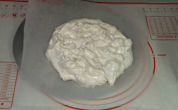 2. Взбитую белковую массу делю на 2 равные части и выкладываю на пергамент диаметром 20 сантиметров. Аккуратненько разравниваю и делаю равномерной толщины корж. Подготовленный корж перекладываю на подставку. Готовлю второй корж. Оставшуюся массу также выкладываю на пергамент, диаметром 20 сантиметров. На втором корже формирую легкие пики. Также перекладываю корж на подставочку. Буду ставить для сушки в духовку, заранее разогретой, до 150 градусов на 1 час. Коржи находились духовке ровно один час. Они хорошо потсушились можно слышать звук. Нужно немножко терпения и дать им полностью остыть.