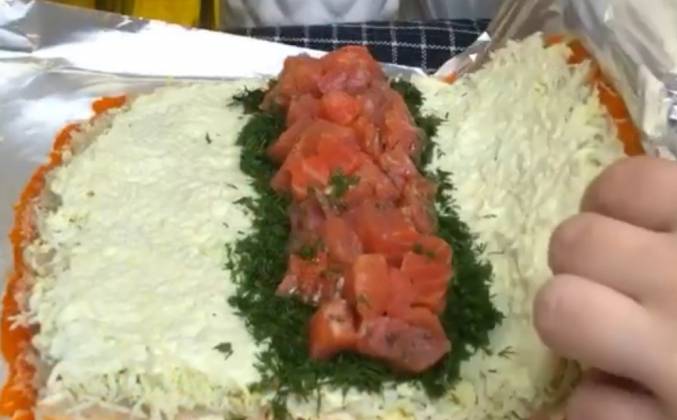 Готовим очень вкусный салат царский с красной икрой и рыбой семгой рецепт в виде закуски на праздничный стол, к примеру на Новый Год.