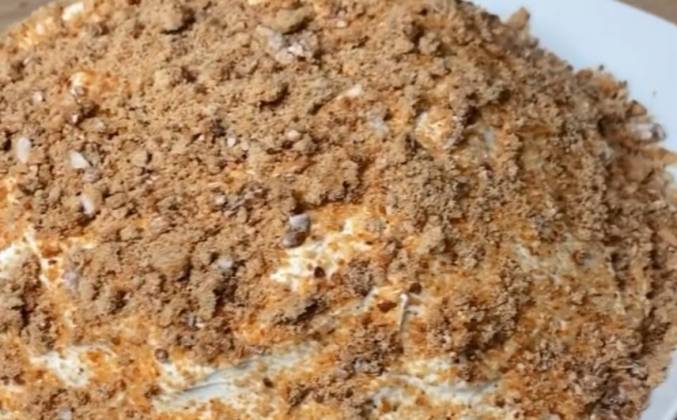 3.  Прошло время, достаем наш торт, переворачиваем и обмазываем со всех сторон сметаной. Дальше обсыпаем крошкой от пряников и супер простой торт готов. Я уверен что вкус этого десерта вас очень приятно удивит.