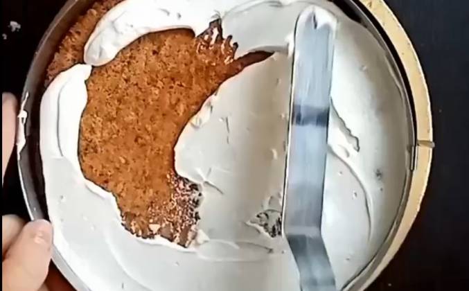 4. По кругу делаем бортик из крема, в центр выливаем полностью остывшую карамель > кладём второй корж > крем. Отправляем в холодильник на пару часов. Далее снимаем кольцо, смазываем бока и украшаем по своему желанию. Самый вкусный торт готов.Видео рецепт ютуб ниже 👇