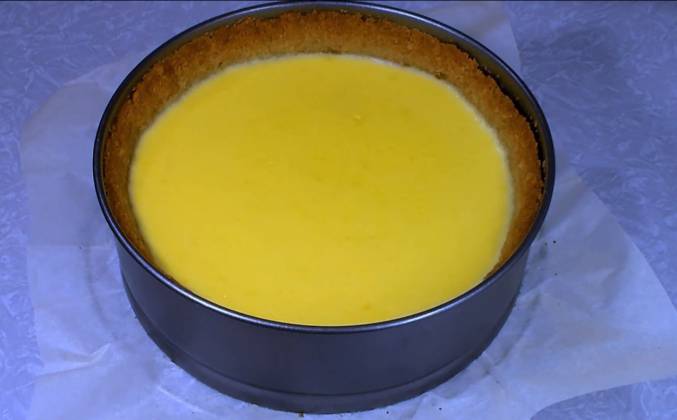 2. Тем временем пока остывает песочная основа приготовим начинку. В миску переложила творог, добавляю к нему сахар. И перетираю вилочкой. Теперь добавляю кукурузный крахмал и продолжаю перемешивать. Добавляю ванильную пасту, цедру лимона и лимонный сок. Еще раз все хорошенечко перемешиваю. Теперь в полученную массу ввожу по одному яйцу и пульсирующими движениями перемешиваю миксером. В завершение ввожу сметану и все хорошенечко перемешиваю лопаткой. Подготовленную начинку вливаю и заполняю форму.