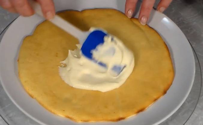 2. Ставлю в заранее разогретую духовку, до 180 градусов, для запекания. Запекаться будет 5 - 7 минут. Все зависит от вашей духовки. Коржи готовы! Из данного количества теста у меня получилось 10 коржей и плюс один корж я измельчила в крошку, для присыпки боков торта. Приступаем к приготовлению крема. Для этого в охлажденную чаша миксера вливаю холодные сливки. Ставлю сначала их взбивать на небольшой скорости. Крем готов и можно приступать к сборке торта.