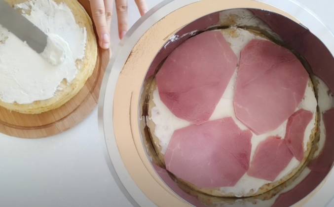 2. Сборка: блинчик - творожный сыр-огурец-блинчик-творожный сыр- помидор - блинчик - творожный сыр - мясо и т д.