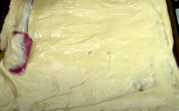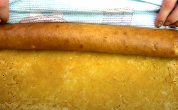 3. Перемешиваем, тесто готово, прошло семь минут, достаём яблоки из духовки и поливаем яблоки, тесто разравниваем, ставим обратно в духовку и выпекаем при 180 градусах 15-20 минут или ориентируйтесь по своей духовке, убираем бумагу для выпечки и сразу сворачиваем рулет при помощи полотенца.