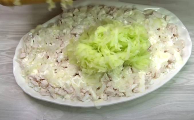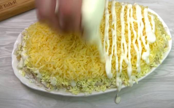 3. Майонез я сделала домашний, как я его делаю я уже много раз делилась на своем канале, ссылку я оставлю в описание. Для удобства я майонез кладу в мешочек, и отрезаем уголок. Приступаем к сборке салата. Я буду делать в форме овала, Вы можете сделать круг или квадрат, вообщем все на ваше усмотрение. Первым слоем кладем белки, смазываем майонезом. Вторым слоем кладем куриную грудку, смазываем майонезом. Третьим слоем кладем подготовленный лук.