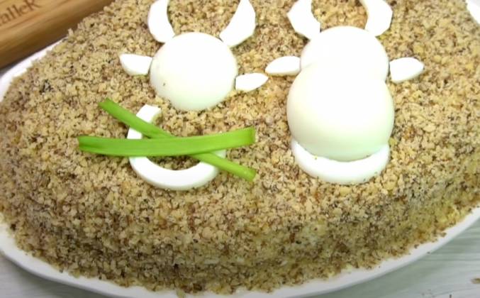 Готовим вкусный Салат Бык на Новый Год 2021 в виде быка рецепт от Наталья Калинина. Салат готовится из простых продуктов: яблок, лука, сыра, яиц, куриной грудки и грецких орехов.