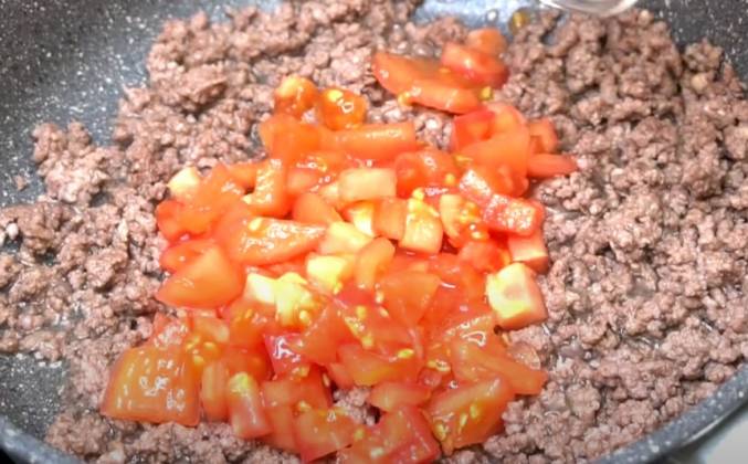 2. Теперь делаем ножом крестообразный надрез и снимаем кожицу. Нарезаем помидор кубиками. Кожицу убирать не обязательно, но мне больше нравится без нее. Теперь кладем помидоры к фаршу и жарим все вместе еще 3-4 минуты. Одновременно ставим варить макароны в подсоленной воде. Теперь добавляем магги на второе для макарон в томатно-мясном соусе боланьзе.