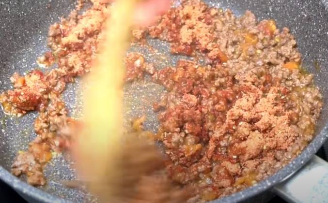 3. Здесь за нас уже подобрано сбалансированное количество овощей, трав, специй и даже соль, и мука есть. Добавляем к фаршу с помидорами, перемешиваем и вливаем 300 мл воды. Огонь убавляем и готовим на среднем огне 10 минут. Иногда перемешиваем, чтобы ничего не подгорело. Подаем с макаронами.
