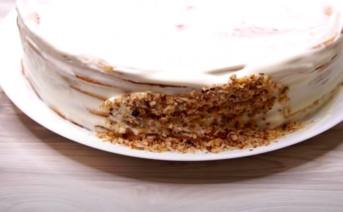 3. Готовим сметанный крем: пол килограмма сметаны жирностью 20 % мешаем с 2-3 столовыми ложками сахарной пудры, мешаем венчиком, если взбивать миксером крем будет очень жидкий, делаем торт, промазываем коржи сметанным кремом и кладем один на один, обмазываем верх и бока тортика, на бака насыпаем измельчённые грецкие орешки, верх поливаем шоколадом по спирали.