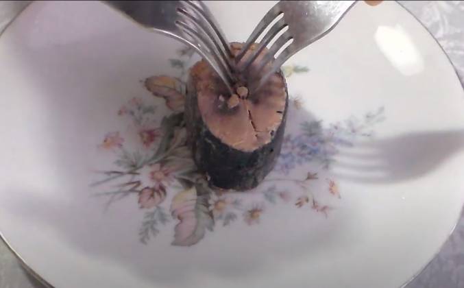 2. Кусочки тунца разделяю на две части. Удаляю косточки. И делю мякоть рыбы на маленькие кусочки. В маринад, в котором находилась рыба, добавляем немного лимонного сока. Часть сока добавляю в грушу и авокадо, чтобы они не потемнели. Все хорошенько перемешиваем и приправляем специями. Если это необходимо. Все компоненты готовы! Можно приступать к сборке салата. Салат можно подавать в общем блюде или порционно. На блюдо выкладываем порезанное куриные яйца, На яйца выкладываем слой груши.