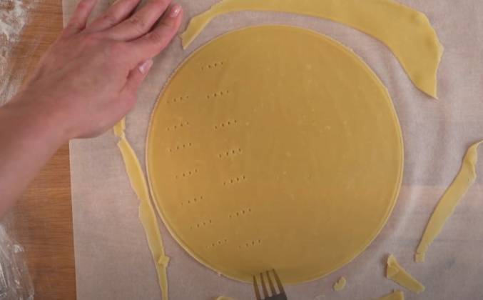 3. Очень тонко раскатать на бумаге для выпечки или силиконовом коврике, обрезать по кругу с помощью тарелки или формы для выпечки диаметром 20-22 см. Обрезки отодвинуть в сторону, тесто наколоть вилкой, выпекать в заранее разогретой духовке 190° 3-4 минуты до золотистого цвета (смотрите по вашей духовке, возможно, вам хватит 180 градусов.) Готовый корж перевернуть, снять бумагу, дать остыть и только потом их можно складывать друг на друга.