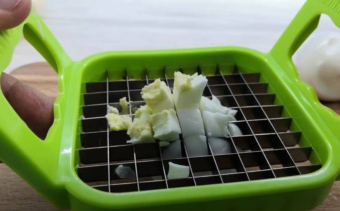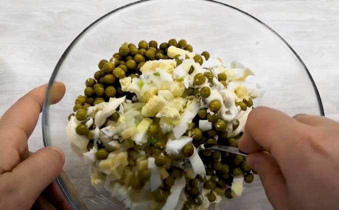 2. Сегодня яйца измельчу с помощью вот такой вот овощерезки которая значительно упрощает хозяйкам жизнь яйца тоже добавили остальным ингредиентам и добавляем банку зеленого консервированного горошка предварительно слив с него всю жидкость. По вкусу добавляем соль Заправляем салат майонезом Майонез, конечно лучше использовать домашний собственного приготовления, где-то у нас на канале уже было.