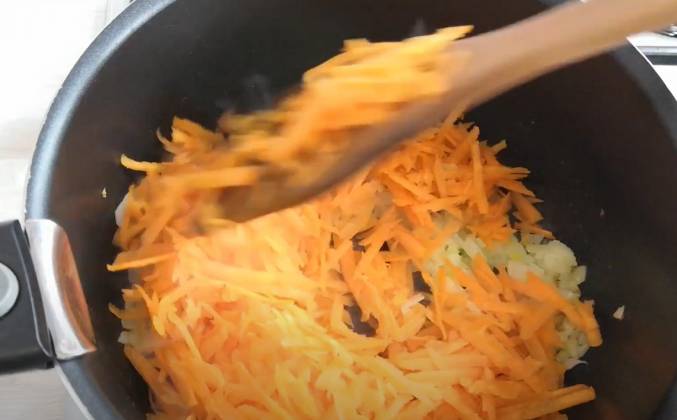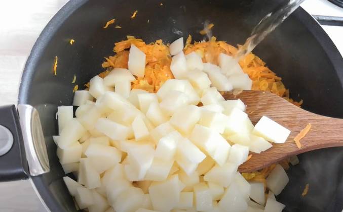 2. К уже слегка обжаренному луку добавляем натёртую морковь и продолжим обжаривать еще буквально пару минут на среднем огне сами в это время берем 2 зубчика чеснока среднего размера пропускаем через пресс еще нам с вами понадобится картофель штучек пять шесть среднего размера которые порежем небольшим кубиком. Возвращаемся к обжаренному луку и моркови добавляем чеснок все хорошенько перемешиваем кладем порезанный картофель и вливаем воду. Воду лью сразу из чайника, горячую чтобы это все быстрее сварилась быстрее закипела где-то 1,2 -1,5 литра по вкусу добавляем соль.