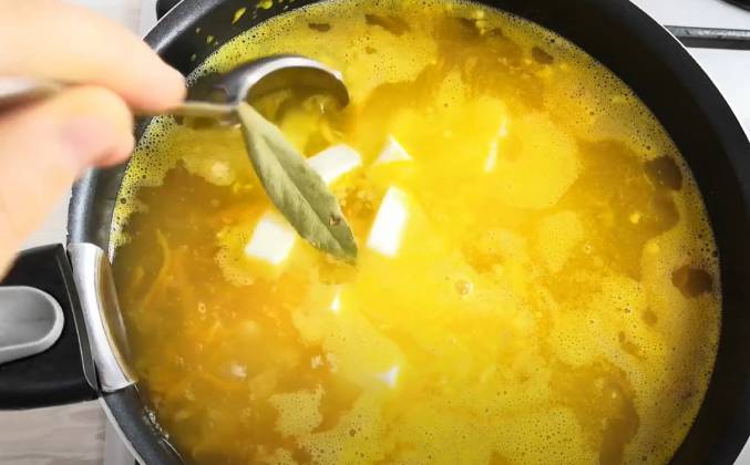 3. Доводим до кипения и продолжаем все это варить на среднем огне сами берем 2 плавленных сырка режем их небольшим кубиком при желании можно воспользоваться теркой натереть на крупной терке теперь порезанные сырки кладем в овощной бульон. Добавляем 1 лавровый листик. Проверяем на вкус соль при необходимости досаливаем варим до готовности картофеля и полного растворения плавленого сыра. Сами в это время режем зелень. Любую какая есть. У меня петрушка укроп и зеленый лук, который прекрасно подходит к этому супу. Ребята суп получается очень нежный, ароматный, сытный и при этом без грамма мяса.Видео рецепт ютуб ниже 👇