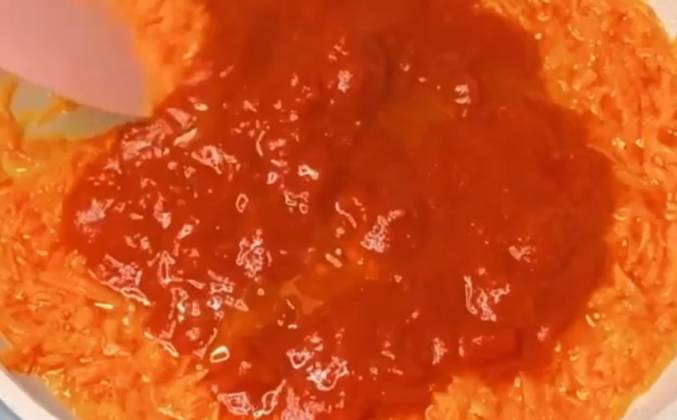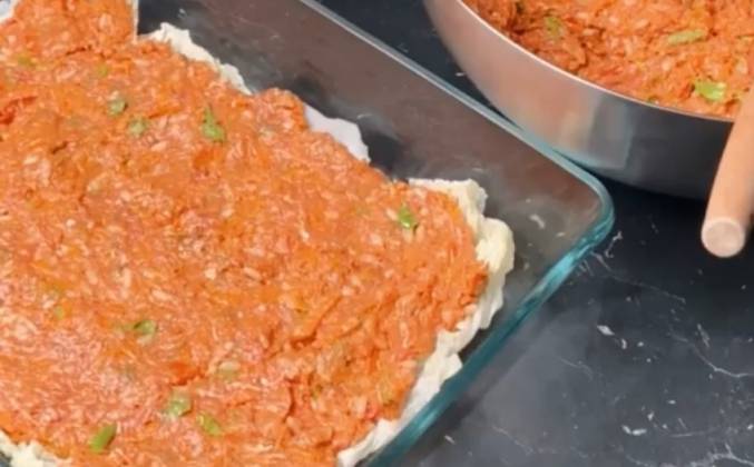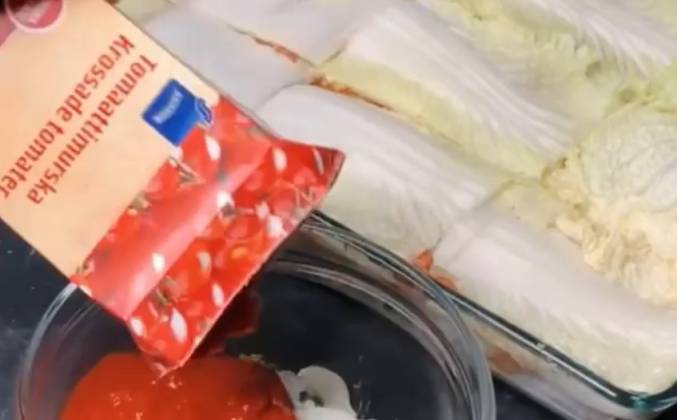 3. Смешиваем сметану с водой и томатной пастой, нарезаем лазанью на порции и поливаем соусом. Накрываем фольгой и отправляем в духовку 200 градусов 30 минут. Затем снимаем фольгу и даём ещё постоять в духовке при 180 градусах 30 минут. За 5 минут до готовности посыпаем тёртым сыром. Наша Лазанья без теста готова!