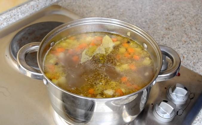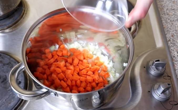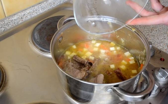 4. Пришло время добавить рёбра и залить водой, воду можно заменить на бульон. Доводим до кипения и провариваем буквально 30 минут чтобы рёбра стали мягкие и морковь тоже. Суп закипел добавлю душистый перец добавлю нагрев. Провариваем 30-40 минут чтобы мясо было полностью мягкая под накрытой крышкой. Друзья прошло 40 минут теперь нужно проверить мясо мягкое но или нет. У меня мясо мягкое мы продолжаем дальше готовить суп. Пришло время добавить картофель, добавляем ещё воды. Доводим суп до кипения и проварить десять-пятнадцать минут до готовности картофеля под накрытой крышкой. Прошло 15 минут проверяем картофель, картофель готов рёбрышки тоже готовый бульон прозрачный то что нам нужно. Смотрите самое главное чтобы ребра были мягкие, если рёбра будет мягкие, то значит всё остальное тоже будет готово.