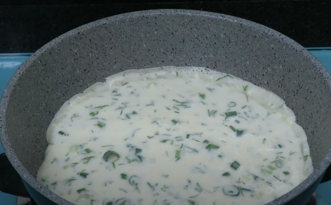 3. Распределяем тесто по сковородке и обжариваем. Жарить будем, как обычно с двух сторон. Хотя у меня на канале есть очень интересный рецепт марокканских блинов, которые жарятся только с одной стороны. Если вам интересно, я обязательно оставлю ссылку под видео в описании. Когда блинчик обжарился с одной стороны, переворачиваем на другую и обжариваем. Эти блины не будут слишком тонким, так как здесь у нас сыр и зелень. Эти блины еще можно назвать блины с припеком. Когда блин обжарился снимаем его на тарелку и жарим следующий блинчик. Снова обязательно перемешиваем тесто и наливаем на сковородку.